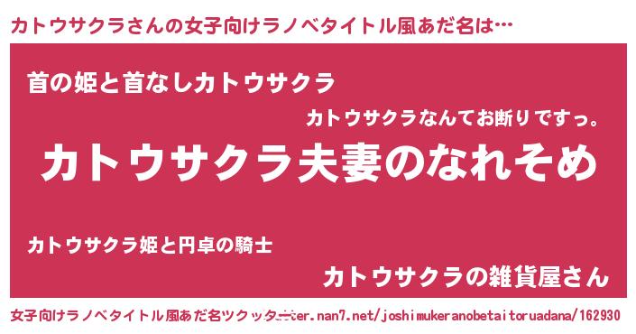 | 男性向けラノベタイトル風あだ名 | 『おまえをオタクにしてやるから、俺をカトウサクラにしてくれ! 』 |
