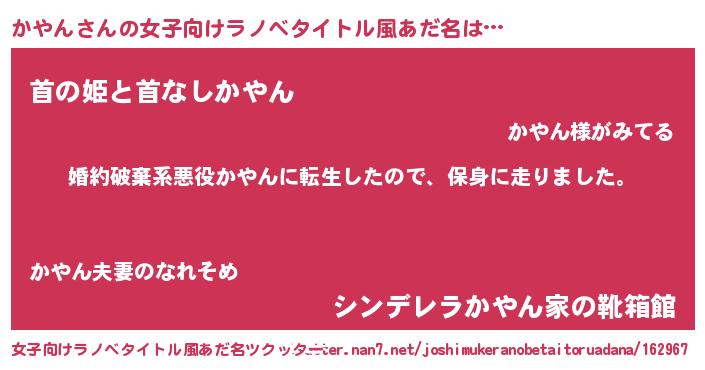 かやんさんの女子向けラノベタイトル風あだ名は… 『婚約破棄系悪役かやんに転生したので、保身に走りました。』『首の姫と首なしかやん』『シンデレラかやん家の靴箱館』 ツクッター #女子向けラノベタイトル風あだ名ツクッター http://tkutter.nan7.net/joshimukeranobetaitoruadana/162967/