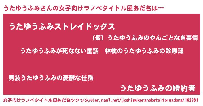 | 意味不明あだ名 | 『住所不定無職うたゆうふみ(47歳)』 |