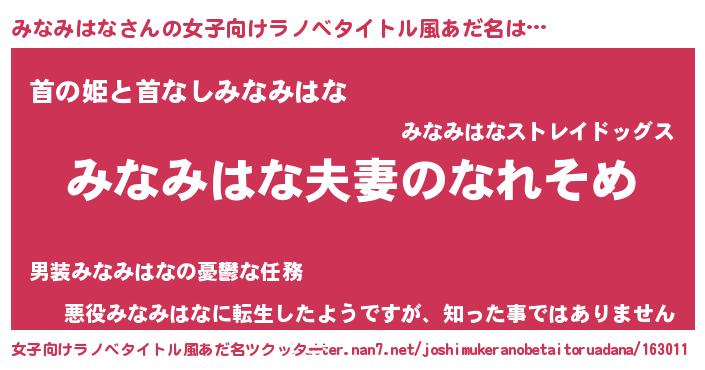 | 男性向けラノベタイトル風あだ名 | 『おまえをオタクにしてやるから、俺をみなみはなにしてくれ! 』 |