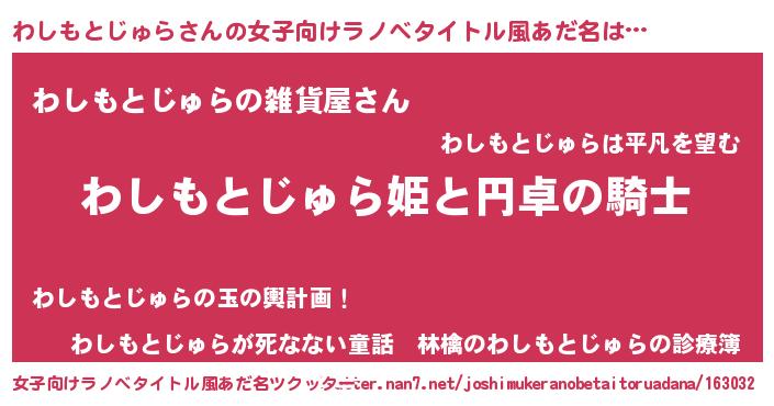 | 男性向けラノベタイトル風あだ名 | 『わしもとじゅらの憂鬱』 |