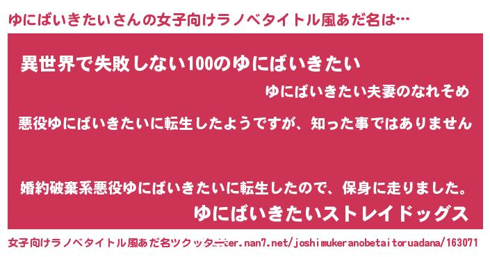 | 男性向けラノベタイトル風あだ名 | 『この素晴らしい世界にゆにばいきたいを!』 |