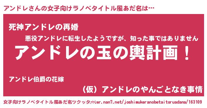 男性向けラノベタイトル風あだ名 | 『アンドレ~年齢イコール彼女いない歴の魔法使い~』 |