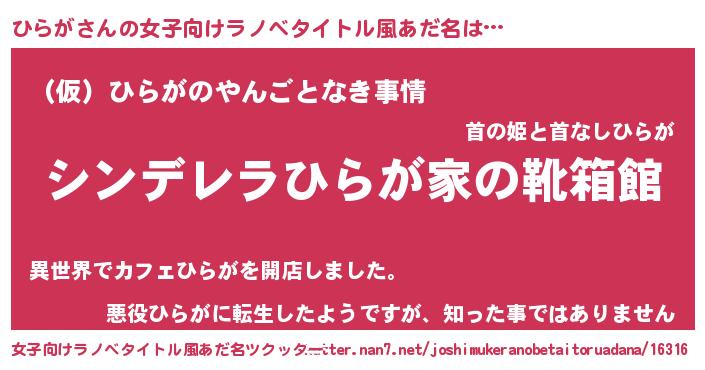 | 男性向けラノベタイトル風あだ名 | 『緋弾のヒラガ』『ひらがの憂鬱』 |