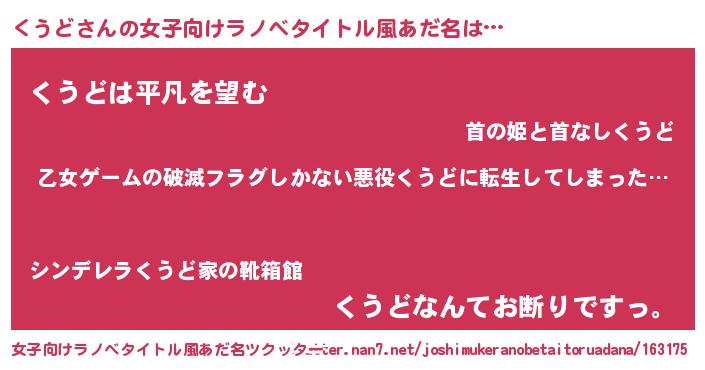| 男性向けラノベタイトル風あだ名 | 『この素晴らしい世界にくうどを!』 |