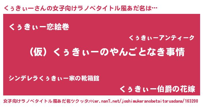 | 男性向けラノベタイトル風あだ名 | 『くぅきぃーの憂鬱』『緋弾のクゥキィー』 |