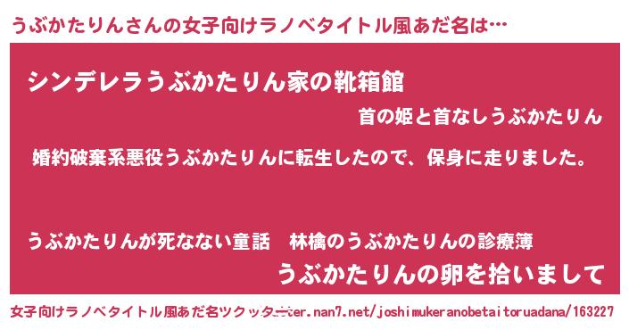 | 胡散臭い通販商品みたいなあだ名 | 『信頼と実績のサプリメント…その名も「うぶかたりん」』 |