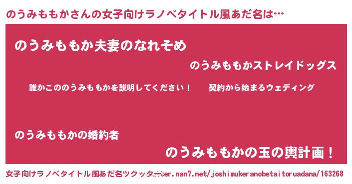 のうみももかさんの女子向けラノベタイトル風あだ名は… 『誰かこののうみももかを説明してください! ~契約から始まるウェディング~』『のうみももか夫妻のなれそめ』『のうみももかの玉の輿計画!』 ツクッター #女子向けラノベタイトル風あだ名ツクッター http://tkutter.nan7.net/joshimukeranobetaitoruadana/163268/