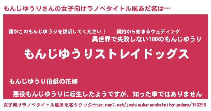 | 男性向けラノベタイトル風あだ名 | 『Re:もんじゆうりから始める異世界生活』 |