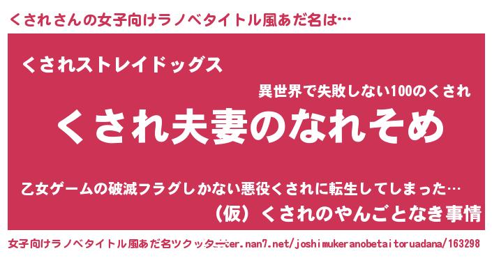 男性向けラノベタイトル風あだ名 | 『おまえをオタクにしてやるから、俺をくされにしてくれ! 』 |