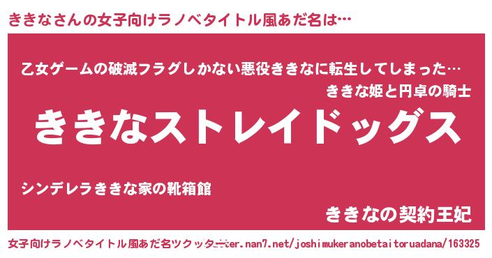 | 男性向けラノベタイトル風あだ名 | 『Re:ききなから始める異世界生活』 |