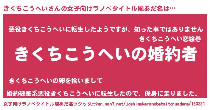 | 男性向けラノベタイトル風あだ名 | 『うちの娘の為ならば、俺はもしかしたらきくちこうへいも倒せるかもしれない。』 |
