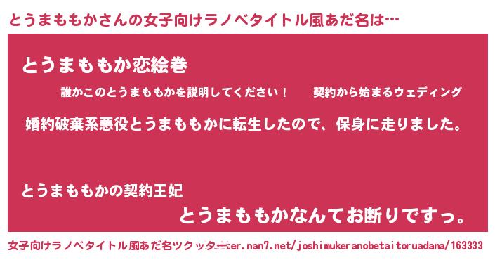 | 男性向けラノベタイトル風あだ名 | 『トウマモモカスレイヤー』 |