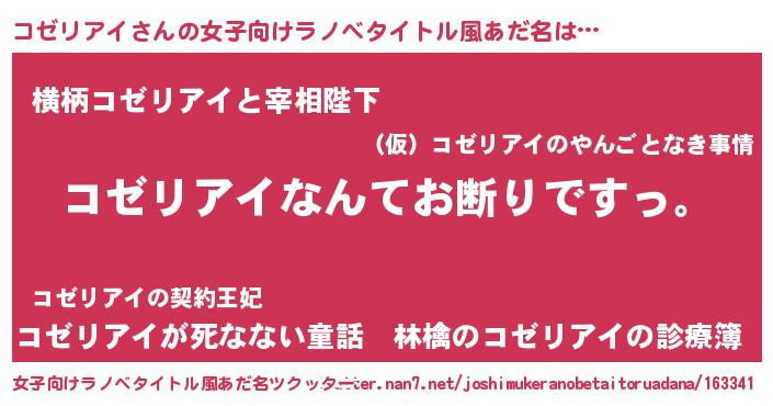 コゼリアイさんの女子向けラノベタイトル風あだ名は… 『コゼリアイなんてお断りですっ。』『横柄コゼリアイと宰相陛下』『コゼリアイが死なない童話 林檎のコゼリアイの診療簿』 ツクッター #女子向けラノベタイトル風あだ名ツクッター http://tkutter.nan7.net/joshimukeranobetaitoruadana/163341/