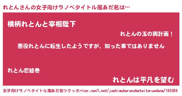| 男性向けラノベタイトル風あだ名 | 『この素晴らしい世界にれとんを!』 |