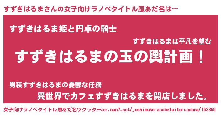 | 男性向けラノベタイトル風あだ名 | 『すずきはるま~年齢イコール彼女いない歴の魔法使い~』 |