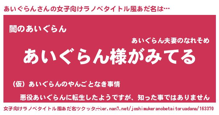 | 男性向けラノベタイトル風あだ名 | 『あいぐらんの嫁は女の子じゃないと思った?』 |