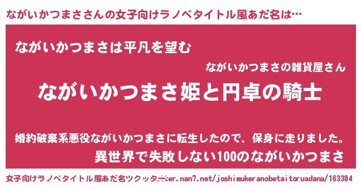 | 男性向けラノベタイトル風あだ名 | 『ながいかつまさの憂鬱』 |
