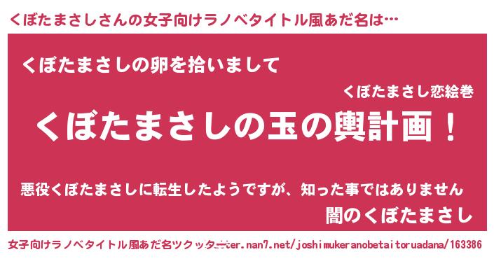 | 男性向けラノベタイトル風あだ名 | 『くぼたまさし~年齢イコール彼女いない歴の魔法使い~』 |