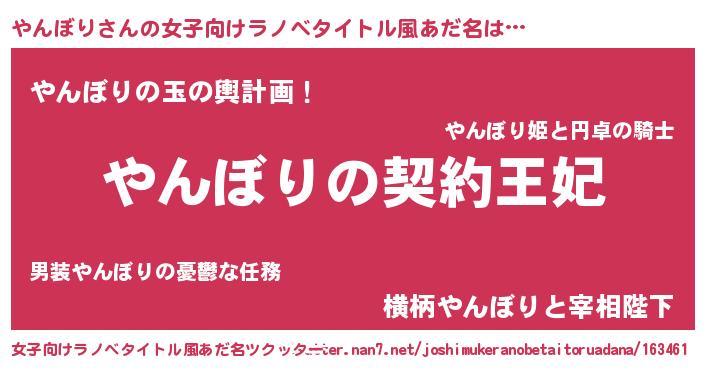 | 男性向けラノベタイトル風あだ名 | 『誰もが恐れるあのやんぼりが、ぼくの専属メイドになるようです。』 |