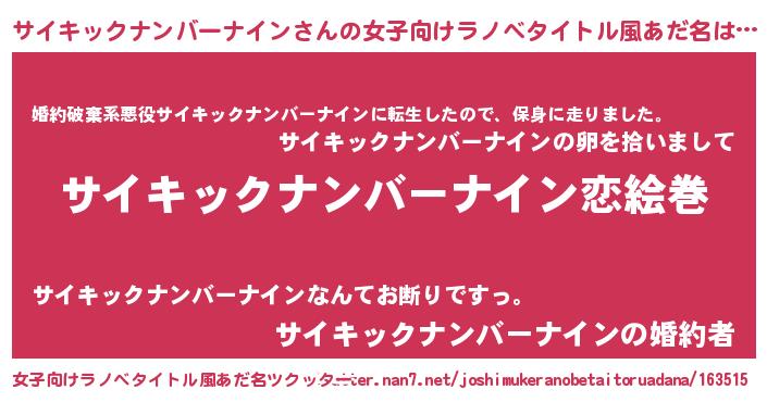 | 男性向けラノベタイトル風あだ名 | 『おまえをオタクにしてやるから、俺をサイキックナンバーナインにしてくれ! 』 |