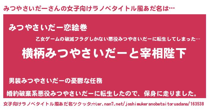 | 男性向けラノベタイトル風あだ名 | 『みつやさいだーに滅ぼされるだけの簡単なお仕事です』 |
