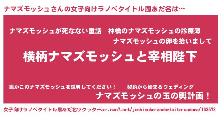 | 男性向けラノベタイトル風あだ名 | 『ナマズモッシュに滅ぼされるだけの簡単なお仕事です』 |