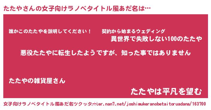 | 男性向けラノベタイトル風あだ名 | 『この素晴らしい世界にたたやを!』 |
