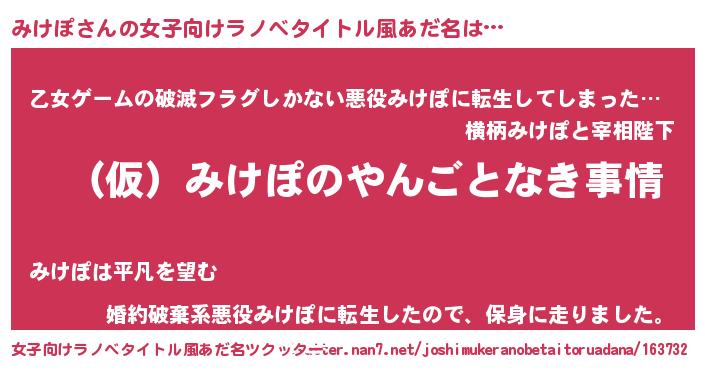 | 男性向けラノベタイトル風あだ名 | 『みけぽの憂鬱』 |