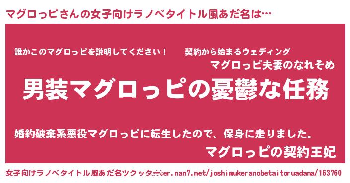 | 男性向けラノベタイトル風あだ名 | 『うちのマグロっピが世界を掌握している!』 |