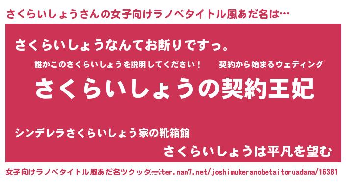 さくらいしょうさんの女子向けラノベタイトル風あだ名は… 『さくらいしょうの契約王妃』『さくらいしょうなんてお断りですっ。』『さくらいしょうは平凡を望む』 ツクッター #女子向けラノベタイトル風あだ名ツクッター http://tkutter.nan7.net/joshimukeranobetaitoruadana/16381/