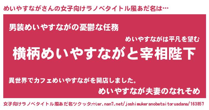 | 男性向けラノベタイトル風あだ名 | 『めいやすながに滅ぼされるだけの簡単なお仕事です』 |