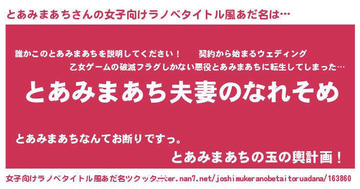 | 男性向けラノベタイトル風あだ名 | 『おまえをオタクにしてやるから、俺をとあみまあちにしてくれ! 』 |