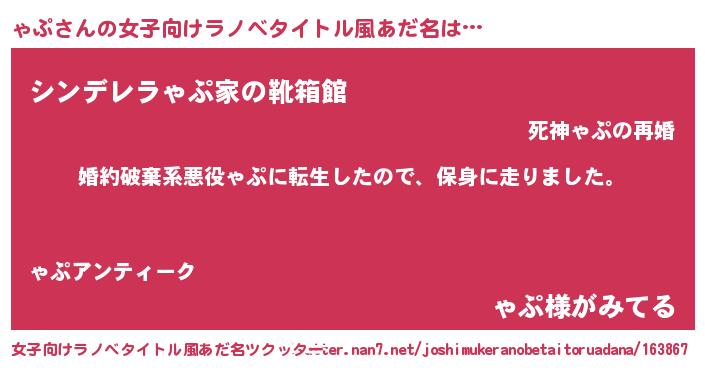 | 男性向けラノベタイトル風あだ名 | 『ャプスレイヤー』『魔法科高校のゃぷ』 |