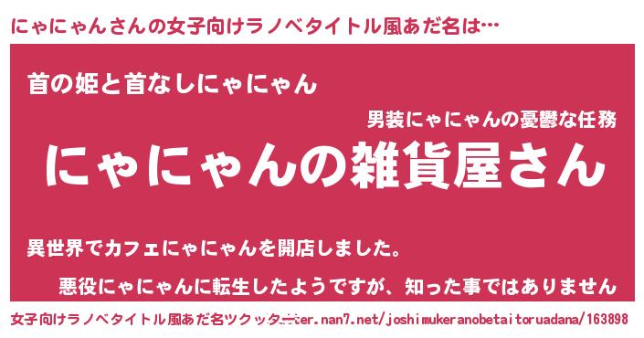 | 男性向けラノベタイトル風あだ名 | 『やはりにゃにゃんの青春ラブコメはまちがっている 』 |