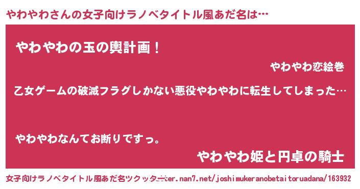 | 男性向けラノベタイトル風あだ名 | 『魔弾の王とやわやわ』『やわやわの憂鬱』 |