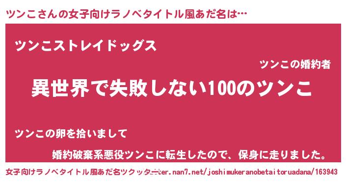 | 男性向けラノベタイトル風あだ名 | 『ツンこという概念が存在しない退屈な世界 』 |