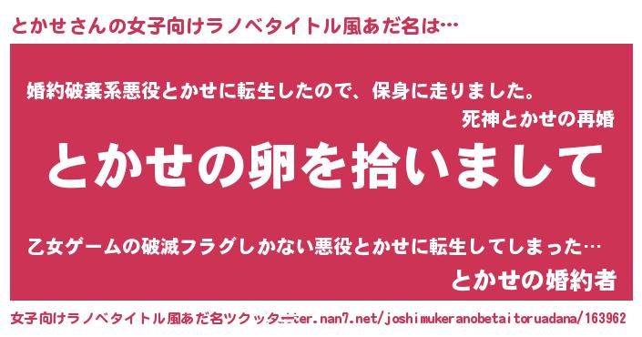 | 男性向けラノベタイトル風あだ名 | 『とかせの嫁は女の子じゃないと思った?』 |