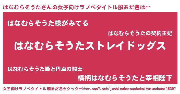 | 男性向けラノベタイトル風あだ名 | 『Re:はなむらそうたから始める異世界生活』 |