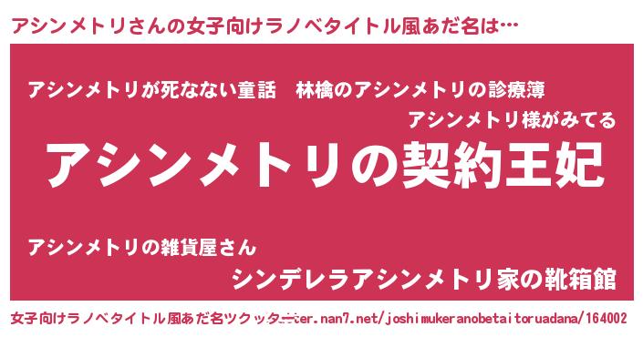 | 男性向けラノベタイトル風あだ名 | 『アシンメトリという概念が存在しない退屈な世界 』 |