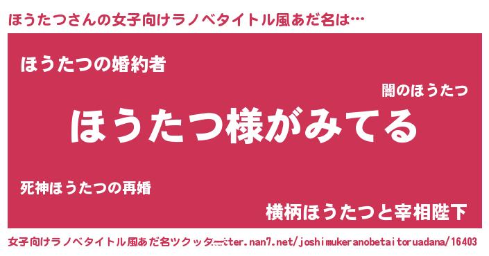 | 男性向けラノベタイトル風あだ名 | 『ほうたつの嫁は女の子じゃないと思った?』 |
