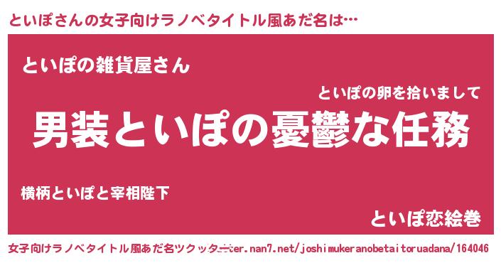 | 男性向けラノベタイトル風あだ名 | 『うちのといぽが世界を掌握している!』 |