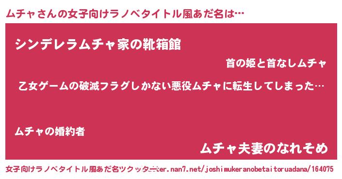 | 男性向けラノベタイトル風あだ名 | 『この素晴らしい世界にムチャを!』 |