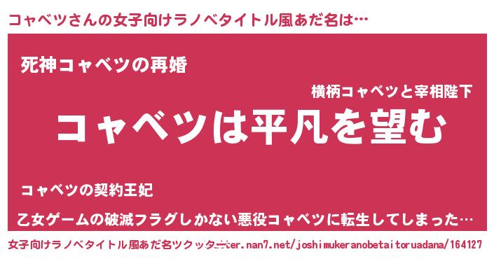 コャベツさんの女子向けラノベタイトル風あだ名は… 『コャベツは平凡を望む』『死神コャベツの再婚』『乙女ゲームの破滅フラグしかない悪役コャベツに転生してしまった…』 ツクッター #女子向けラノベタイトル風あだ名ツクッター http://tkutter.nan7.net/joshimukeranobetaitoruadana/164127/