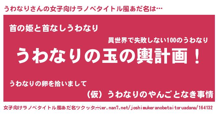 | 男性向けラノベタイトル風あだ名 | 『転生したらうわなりだった件』 |