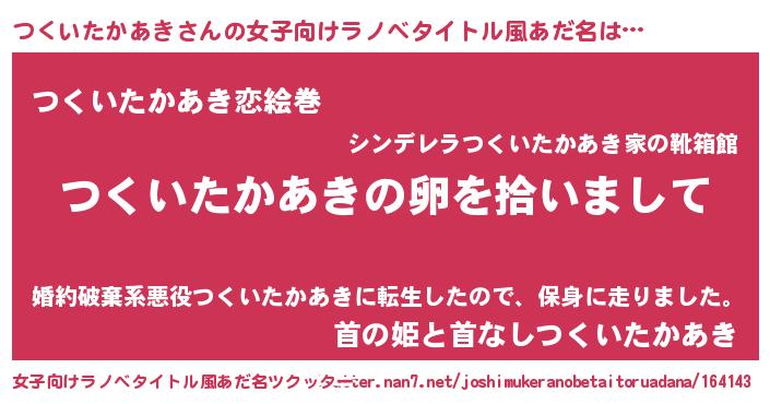 | 男性向けラノベタイトル風あだ名 | 『つくいたかあきの嫁は女の子じゃないと思った?』 |