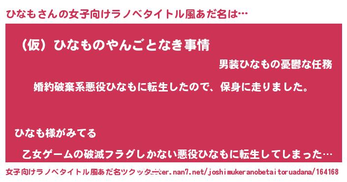 | 男性向けラノベタイトル風あだ名 | 『転生したらひなもだった件』 |