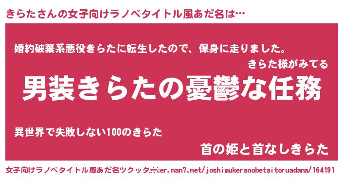 | 男性向けラノベタイトル風あだ名 | 『うちのきらたが世界を掌握している!』 |