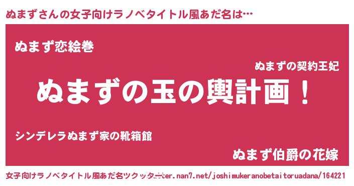 | 男性向けラノベタイトル風あだ名 | 『ぬまず~年齢イコール彼女いない歴の魔法使い~』 |