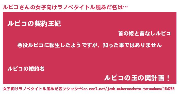 | 男性向けラノベタイトル風あだ名 | 『この素晴らしい世界にルビコを!』 |